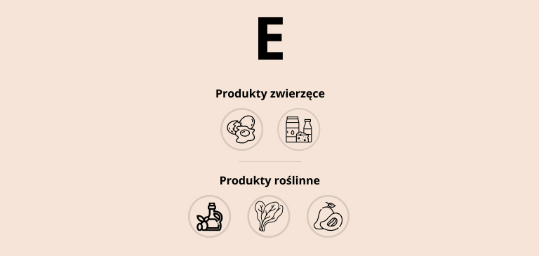 Witamina E w postaci α-tokoferolu występuje w jadalnych olejach roślinnych, zwłaszcza z kiełków pszenicy, w oleju słonecznikowym i rzepakowym. Inne dobre źródła witaminy E to zielone warzywa liściaste (np. szpinak, boćwina), orzechy (migdały, orzeszki ziemne) i pasty orzechowe, awokado, nasiona słonecznika, mango i kiwi.