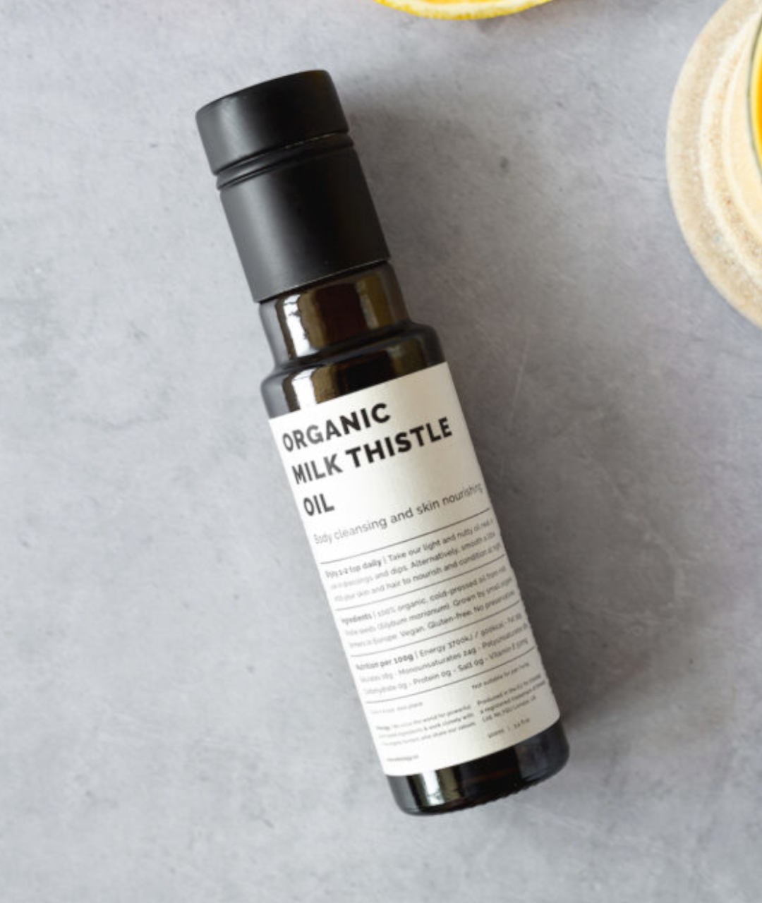 - Olej tłoczony na zimno z organicznych nasion ostropestu.