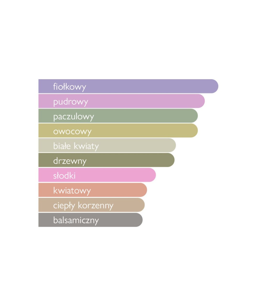 Otwarcie pełne jest dojrzałej śliwki, soczystych owoców i delikatnych fiołków, które wprowadzają aurę intrygi i powabu. W sercu kwiatowe nuty paczuli, jaśminu i róży tworzą zmysłowy bukiet, pełen światła i cienia niczym nocne ogrody pod blaskiem księżyca. Baza z piżma, ambry i wanilii otula ciepłem, dodając tajemniczości i miękkości.