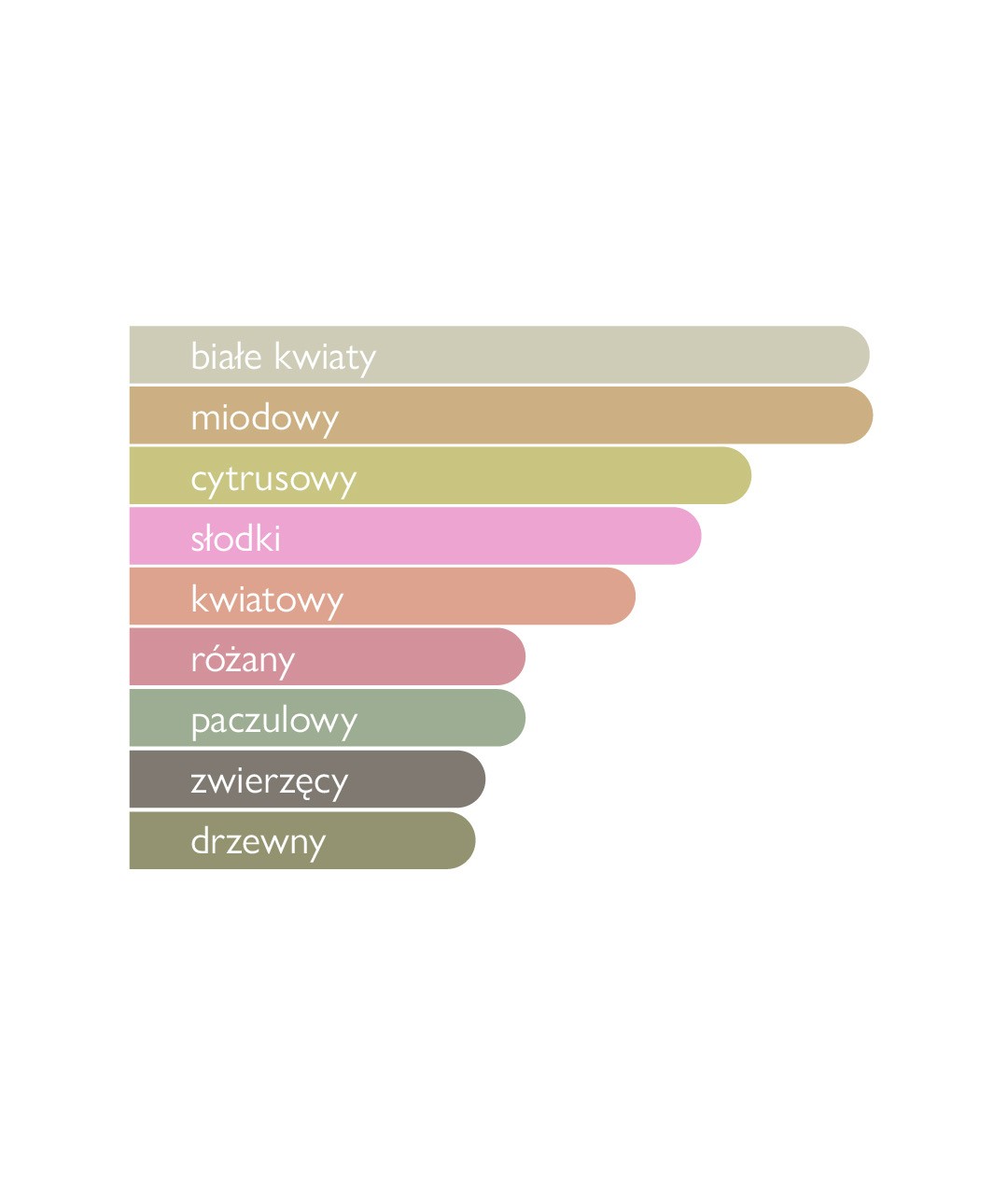 Promienne nuty głowy, wypełnione cytryną i bergamotką, otwierają zapach świeżym, energetyzującym akcentem. W sercu rozkwitają legendy perfumerii – jaśmin, róża i kwiat pomarańczy – tworząc szlachetną i elegancką aurę. Baza z paczuli, białego piżma i odrobiny miodu wnosi zmysłową głębię, czystość i aksamitne ciepło.