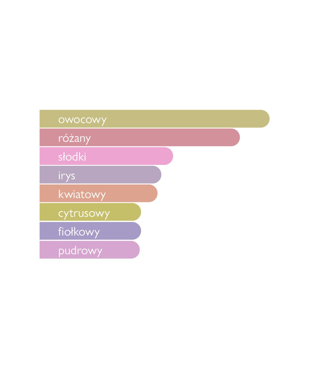 Już pierwsze nuty zapachu emanują świeżością i lekkością: neroli i jeżyna tworzą soczyste, świetliste otwarcie, które otula skórę delikatnym, energetyzującym blaskiem. Akcent bergamotki dodaje lekkości i elegancji. W sercu perfum rozkwita jaśmin sambac, symbol czystego piękna, w towarzystwie klasycznej róży i pudrowego irysa. To trio tworzy harmonijną, kobiecą aurę, która urzeka subtelnością, ale i niecodziennym wyrafinowaniem. Bazę stanowi aksamitne połączenie piżma, ambrette i drzewa cedrowego – zmysłowe i uspokajające wykończenie, które nadaje zapachowi trwałość, głębię i miękkość.