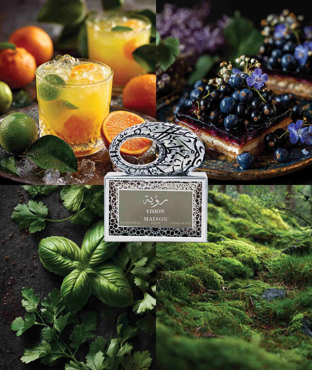 Otwarcie perfum łączy soczyste nuty pomarańczy, zielonej cytryny i czarnej porzeczki, wnosząc energię i klarowność. Serce z bazylii, kolendry i liści białej herbaty dodaje kompozycji wyrafinowanej świeżości, a baza z piżma, mchu i ambry zapewnia subtelne, trwałe i zmysłowe wykończenie.