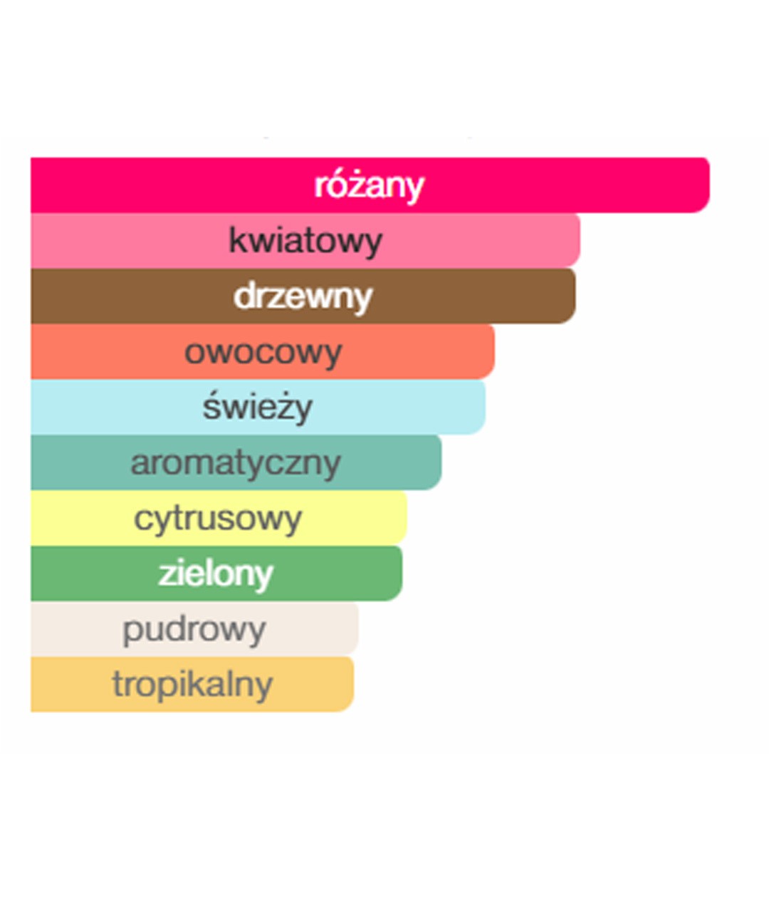 Kompozycja otwiera się świeżym i radosnym akordem liczi, rabarbaru i bergamotki, który wnosi do zapachu lekkość oraz owocową energię. W sercu rozkwita romantyczny duet róży i piwonii, tworząc harmonijną, kwiatową symfonię pełną elegancji i kobiecej finezji. Całość dopełnia ciepła, otulająca baza z cedru, drewna kaszmirowego i wetywerii, nadająca zapachowi głębi, trwałości i zmysłowego charakteru.