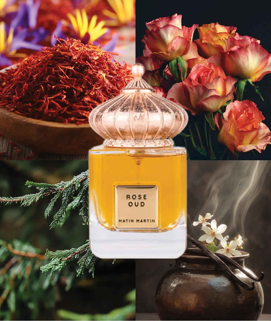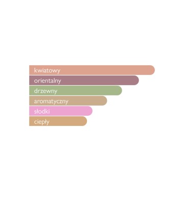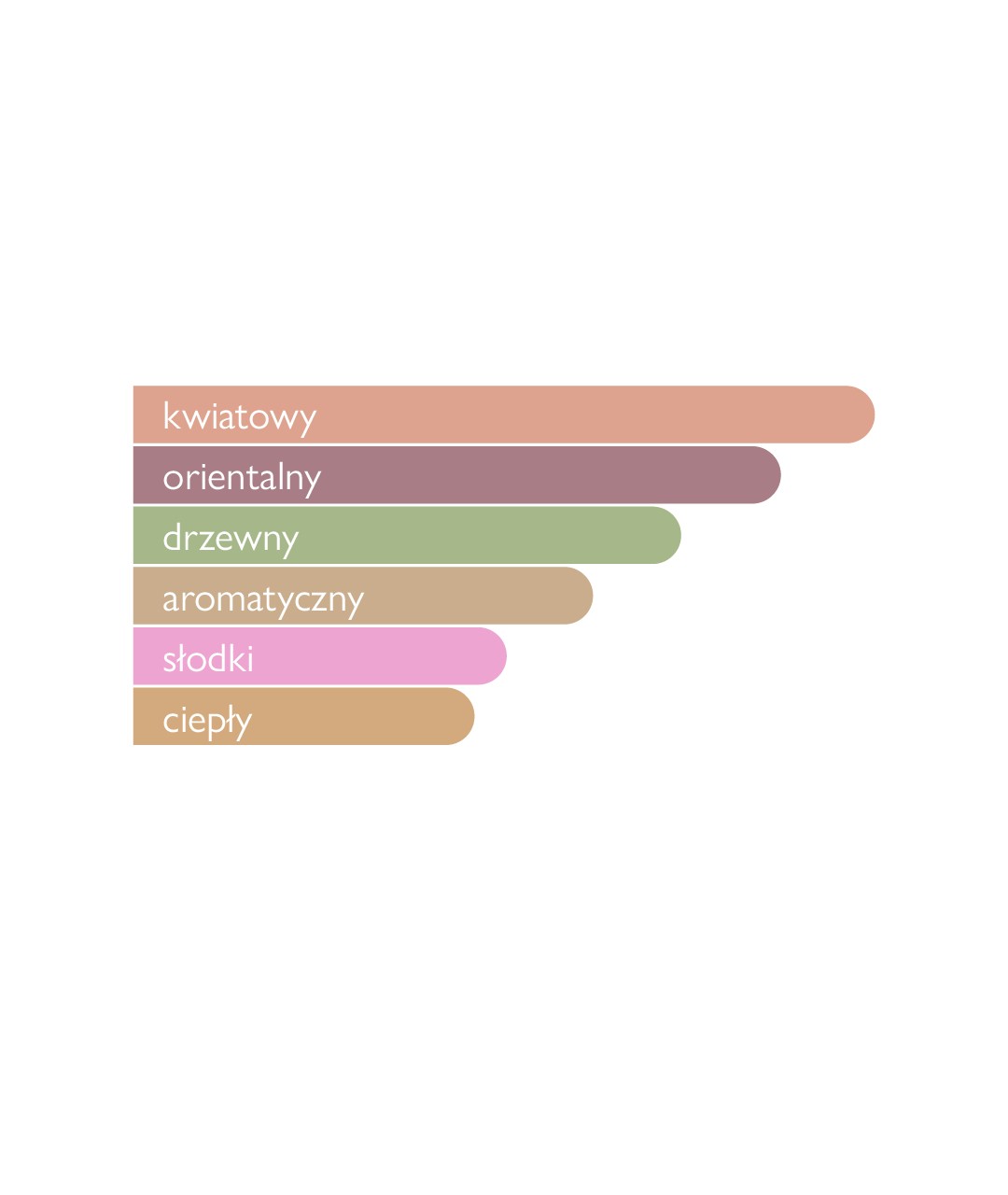 Otwarcie rozbrzmiewa szafranem i bergamotką, wprowadzając ciepło i świeżość. W sercu rozkwita harmonijny bukiet róży, geranium i jaśminu, nadając zapachowi kobiecy, kwiatowy charakter, który jest jednocześnie świeży i uwodzicielski. Baza z oudu, drzewa sandałowego i cedru dopełnia kompozycję, tworząc egzotyczny, drzewny aromat o trwałym i zmysłowym wykończeniu.